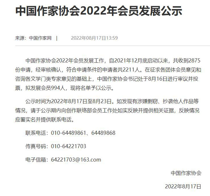 中国作家协会2022年会员发展公示。来源:网页截图。