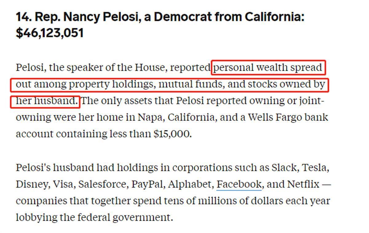 2021年12月,美国“商业内幕”网站通过分析财务报告估算了美国国会议员的净资产,并公布了议员富人榜。在25名国会议员中,佩洛西排在第14位,相关数据显示,她的个人净资产在去年年底已超过4600万美元。