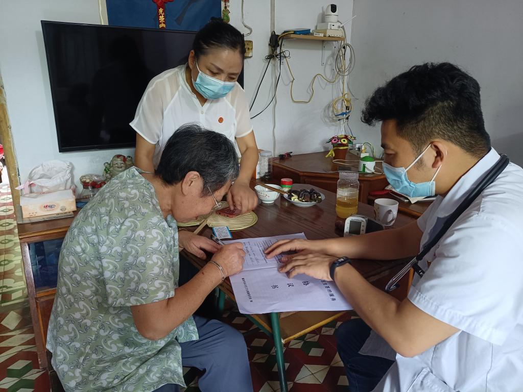 图为王均(右)同村民签署家庭医生服务协议。(受访者供图)