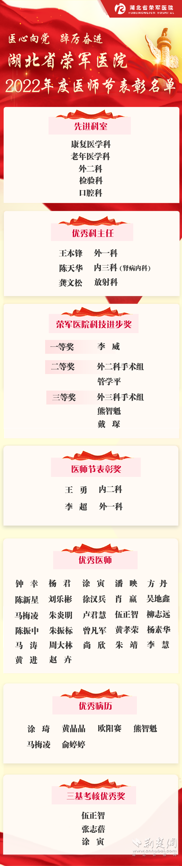 荆楚网(湖北日报网)讯 (通讯员 孙四海)一袭白衣、一身责任;一腔热血、一念执着。8月17日上午,在第五个中国医师节来临之际,湖北省荣军医院以“医心向党 踔厉奋进”为主题举行2022年度医师节表彰大会,向全院医务工作者致以节日的问候和美好的祝福。