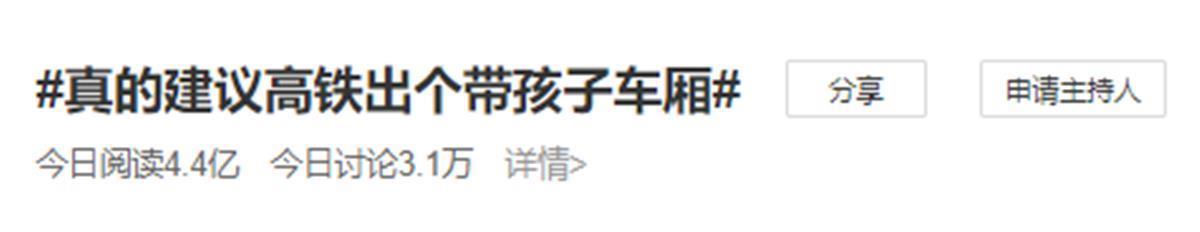 连日来,几件因“熊孩子”在高铁上吵闹,从而引发家长和其他乘客产生矛盾的事引发网友关注。8月19日,有网友建议,可以设置一个专门的车厢,供孩子和家长乘坐。与此相关的微博话题,阅读量更是高达4.4亿,还登上微博热搜。