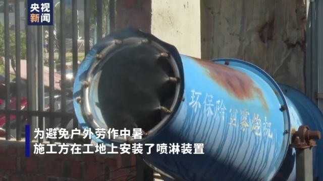为避免工人在户外劳作中暑,施工方在工地上安装了喷淋装置,不断地喷淋水雾,既降温又降尘。同时,在上午11点到下午3点的高温时间,工地选择停工休息。项目部还定时给工人发放防暑降温药品,并准备营养丰盛的工作餐。
