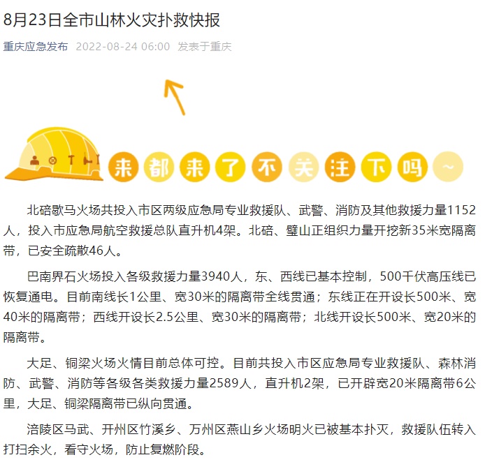 巴南界石火场投入各级救援力量3940人,东、西线已基本控制,500千伏高压线已恢复通电。目前南线长1公里、宽30米的隔离带全线贯通;东线正在开设长500米、宽40米的隔离带;西线开设长2.5公里、宽30米的隔离带;北线开设长500米、宽20米的隔离带。