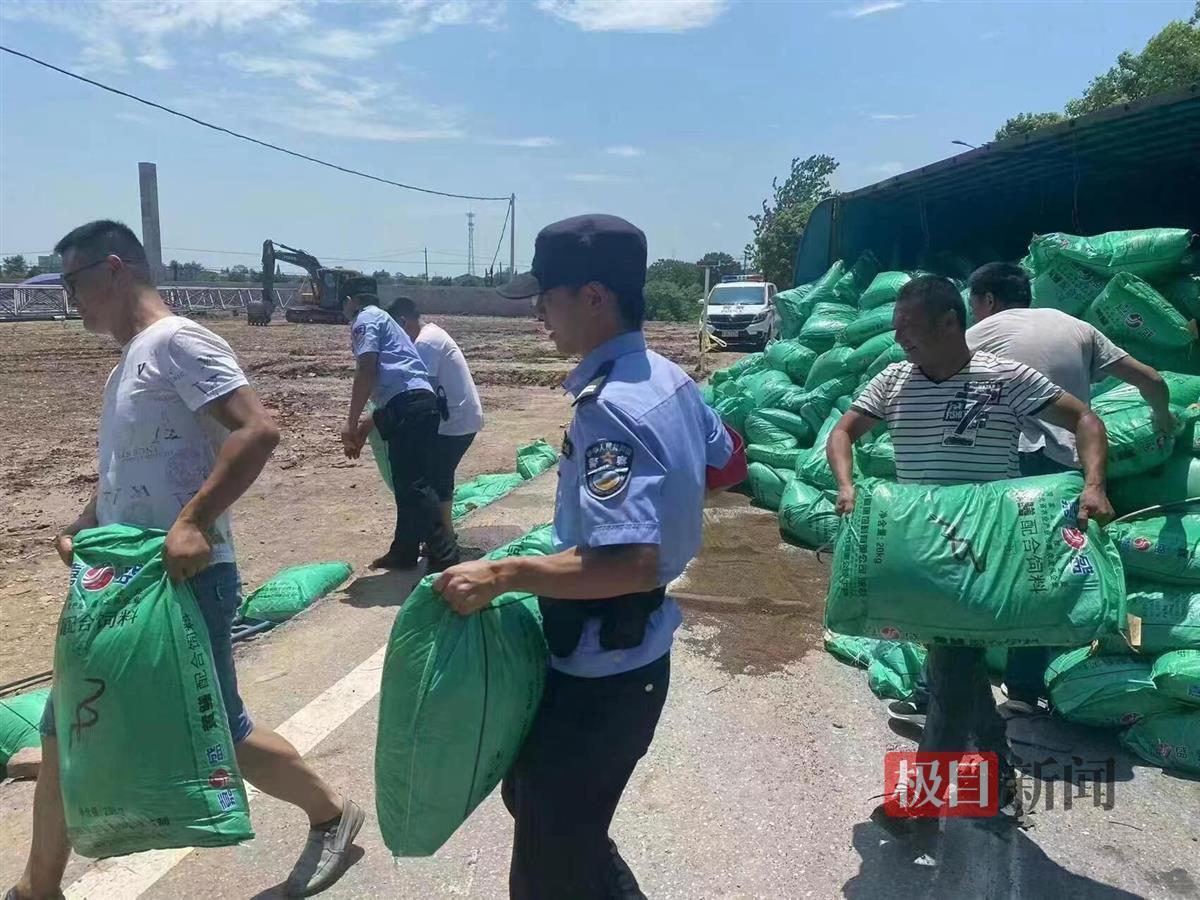 民警与群众一起清理散落的饲料,消除交通安全隐患