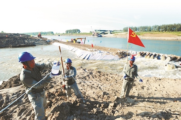 国网湖北电力员工在汉川市汉江庙头镇堤段为河堤上的20台水泵架设供电线路。