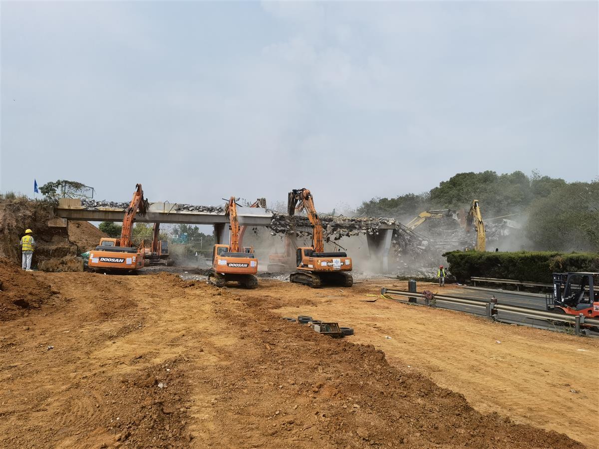 在全封闭交通管制下,7时许,昔日车流滚滚的武汉绕城高速一片宁静。随着湖北交投京港澳改扩建公司党委书记沈典栋一声令下,9座大桥同时机械拆除。在大潭村一号桥下六七米的主线上,装载破碎锤的8台大型挖机,张开“臂膀”朝桥梁“扑”去,“突突”轰鸣声中,瞬间梁板混凝土、钢筋纷纷脱落。