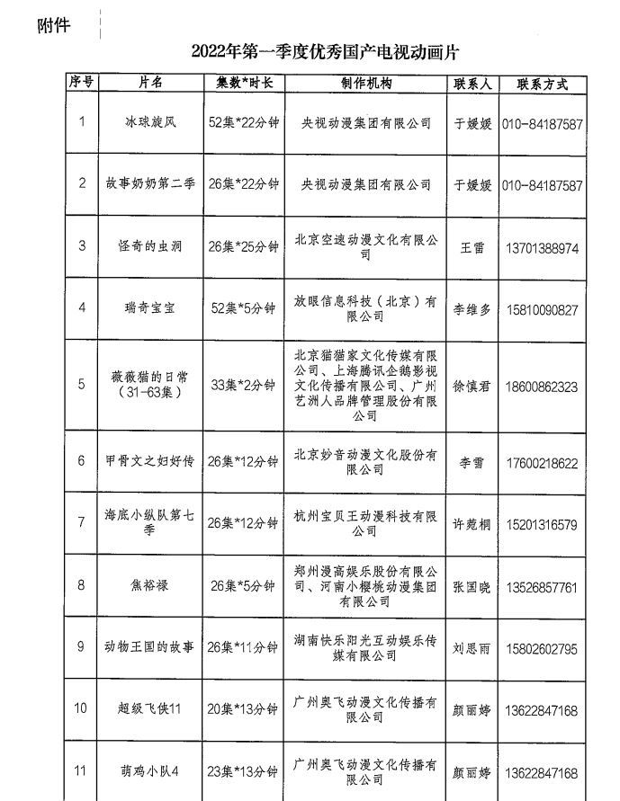 中新网北京8月25日电 据国家广播电视总局25日消息,为繁荣国产电视动画片创作生产,充分发挥优秀国产电视动画片的示范带动作用,经省级广播电视行政部门、中央广播电视总台推荐,国家广播电视总局组织专家评审,确定《冰球旋风》《焦裕禄》《怪奇的虫洞》《超级飞侠11》等11部作品为2022年第一季度推荐优秀国产电视动画片。(完)