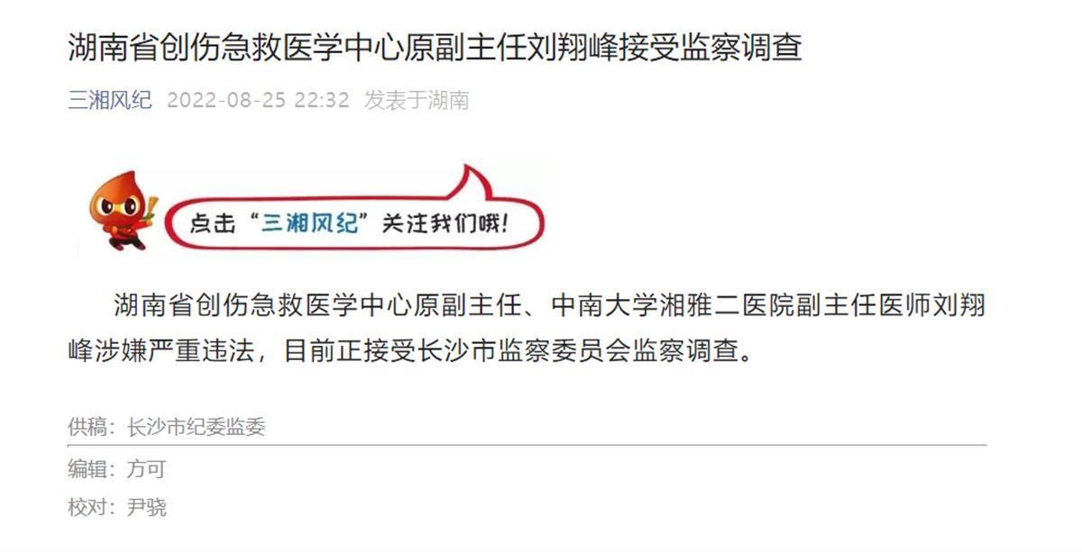 8月25日晚,中共湖南省纪律检查委员会官方公众号三湘风纪发文称:湖南省创伤急救医学中心原副主任、中南大学湘雅二医院副主任医师刘翔峰涉嫌严重违法,目前正接受长沙市监察委员会监察调查。