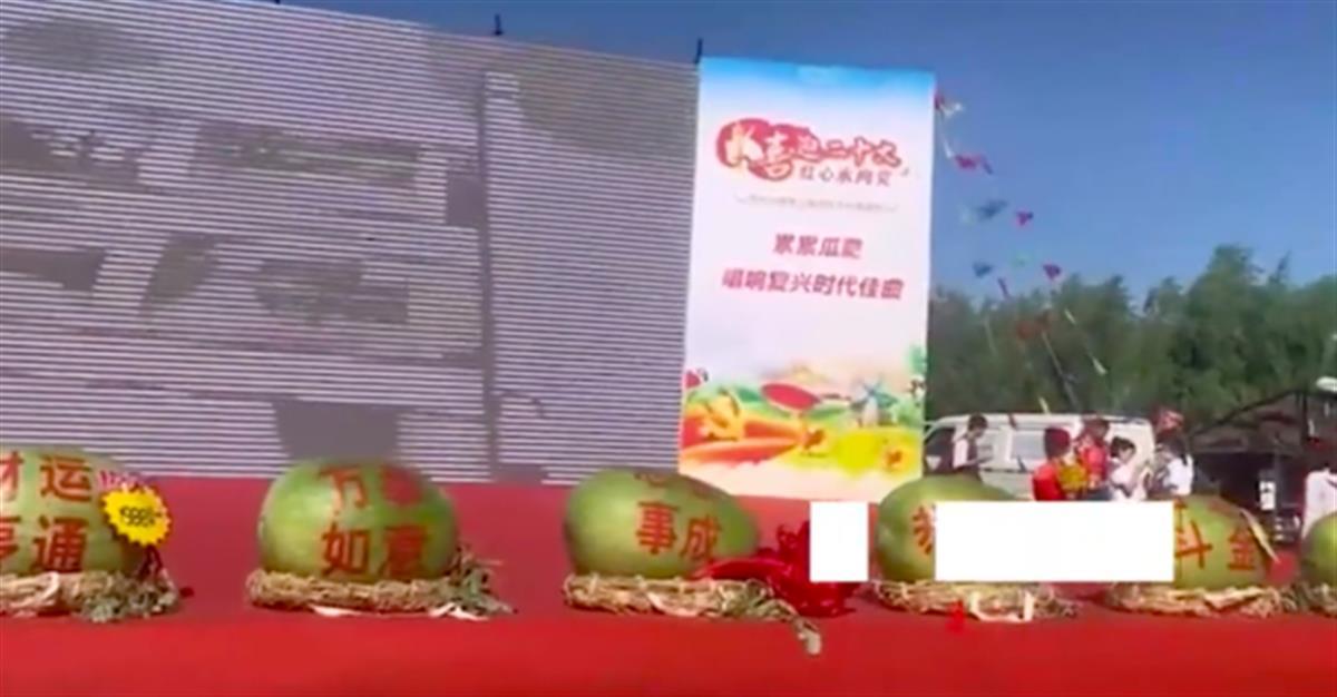 网传短视频显示,在一个西瓜节上,有几个西瓜被贴上了“心想事成”“时运亨通”“万事如意”的标签。每个西瓜看起来,个头都很大。摆在中间的是175斤重的瓜王“心想事成”。主持人说,起拍价8888元起。