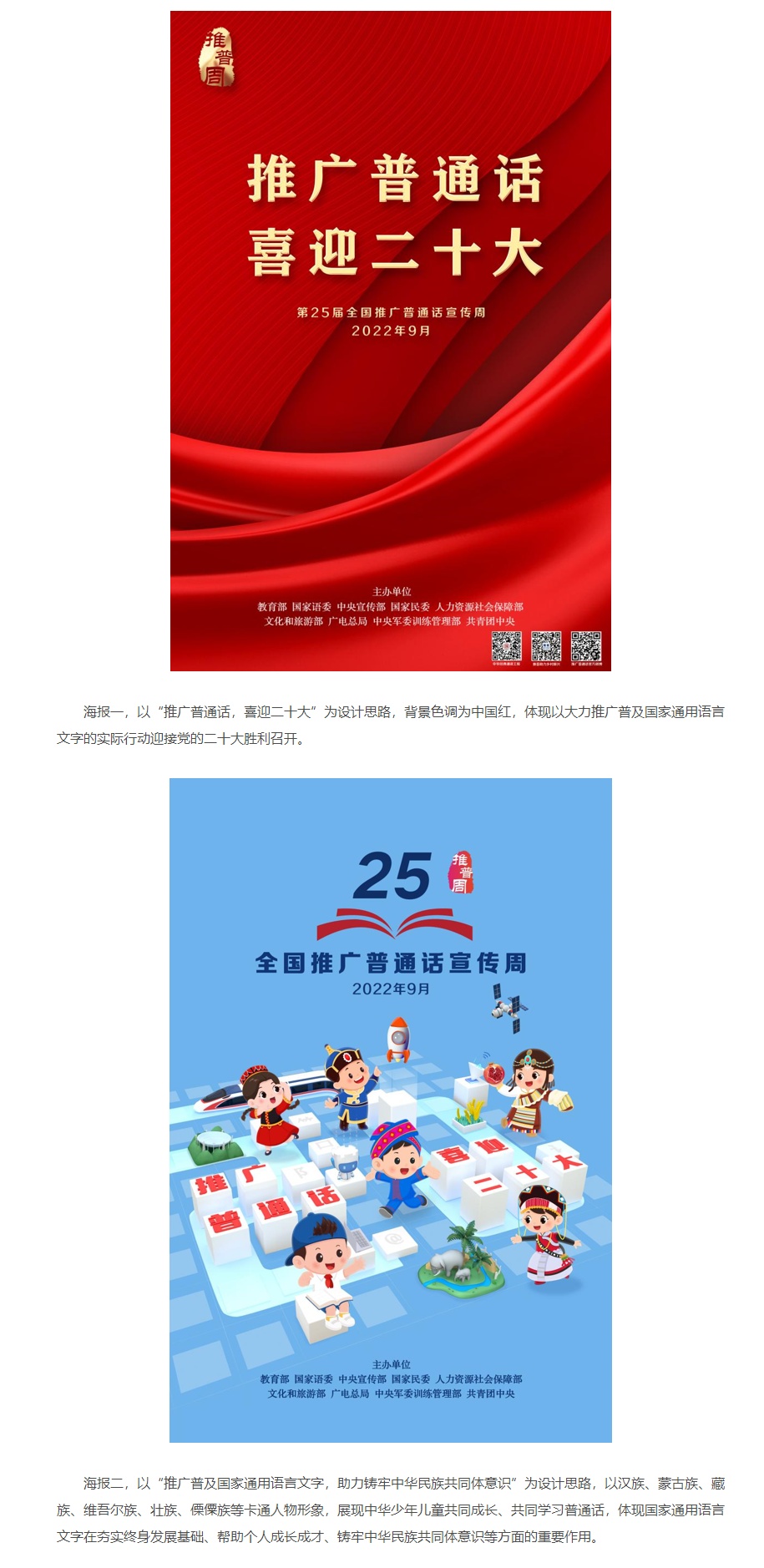 经国务院批准,自1998年起,每年9月第三周为全国推广普通话宣传周(简称推普周)。今年是第25届推普周,主题为“推广普通话,喜迎二十大”。今天,教育部发布第25届全国推广普通话宣传周海报。