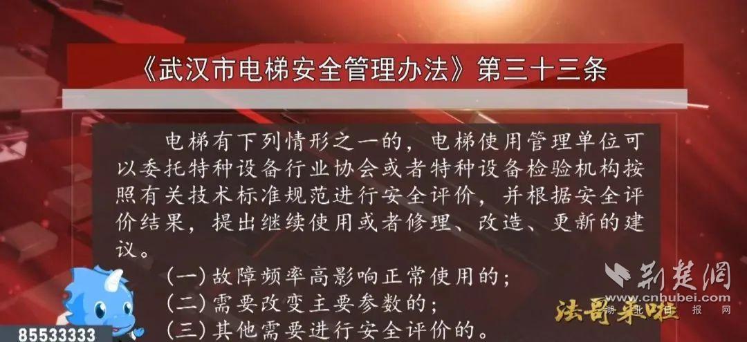 对此,《武汉市电梯安全管理办法》明确规定,可以由电梯的使用管理单位也就是物业,来聘请第三方机构做安全评估,并根据安全评价结果,提出继续使用或者修理、改造、更新的建议。