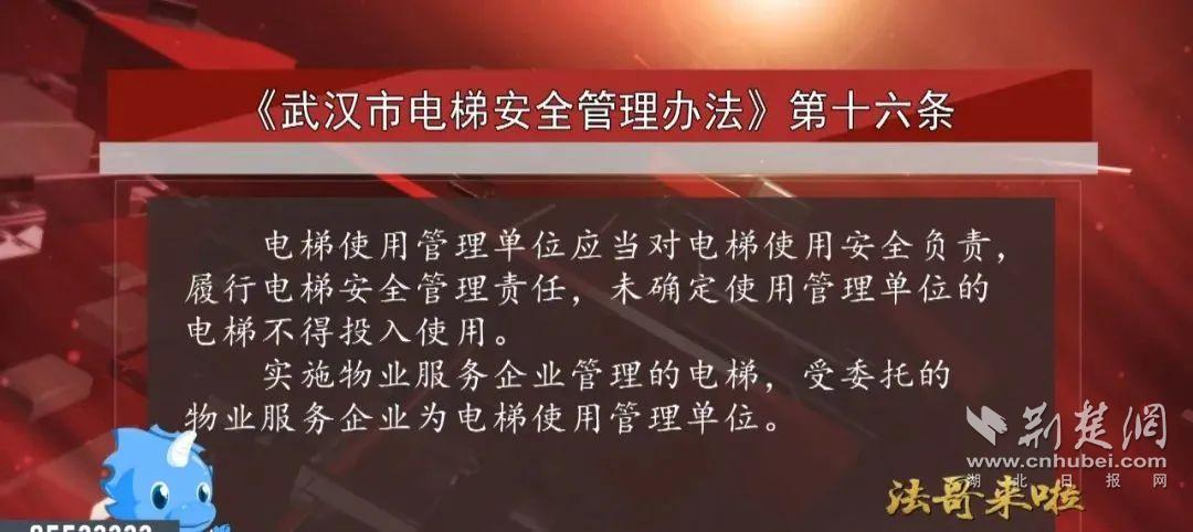 “如果我们居民碰到电梯故障,第一应该向物业服务企业来进行报告,物业服务企业就根据电梯所处的阶段,如果在质保期之内,就向电梯的生产单位进行申报,如果过了质保期,就向电梯的维护保养单位进行报告。”国浩律师(武汉)事务所党支部副书记胡斌介绍,根据《武汉市电梯安全管理办法》以及《武汉市物业管理条例》,实施物业服务企业管理的电梯,由物业服务企业作为电梯使用管理单位,来履行电梯安全管理职责,包括日常巡查、电梯故障处理等。