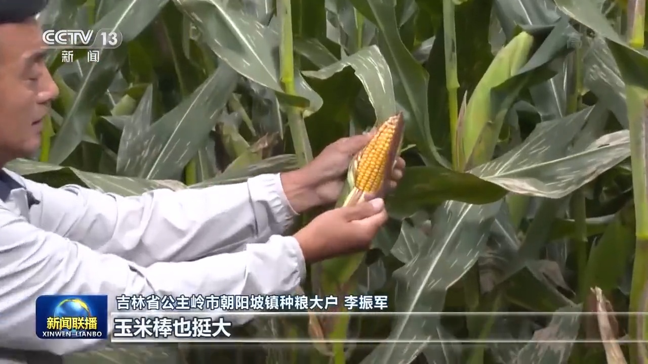 吉林省公主岭市朝阳坡镇种粮大户 李振军:玉米棒也挺大,上面的粒非常饱满,现在看每亩一千七八百斤不成问题。