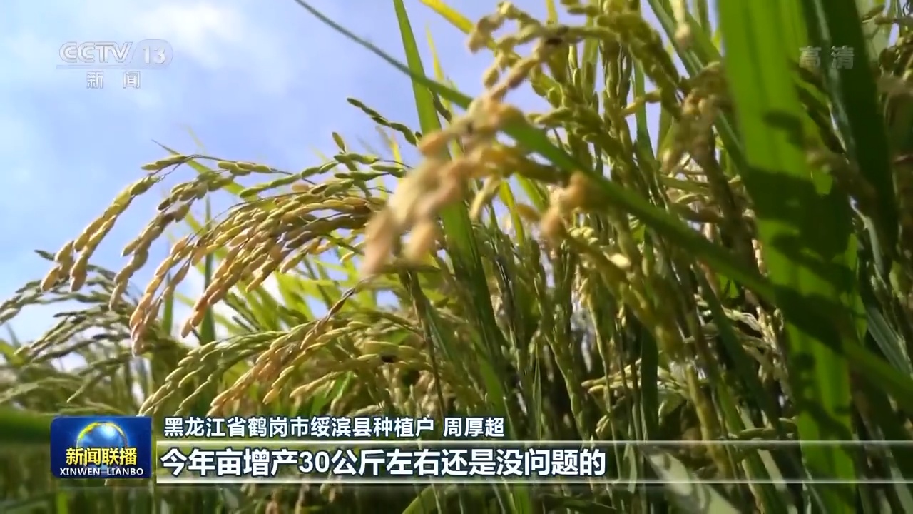 黑龙江省鹤岗市绥滨县种植户 周厚超:看水稻现在的长势、成熟度,今年亩增产30公斤左右还是没问题的。