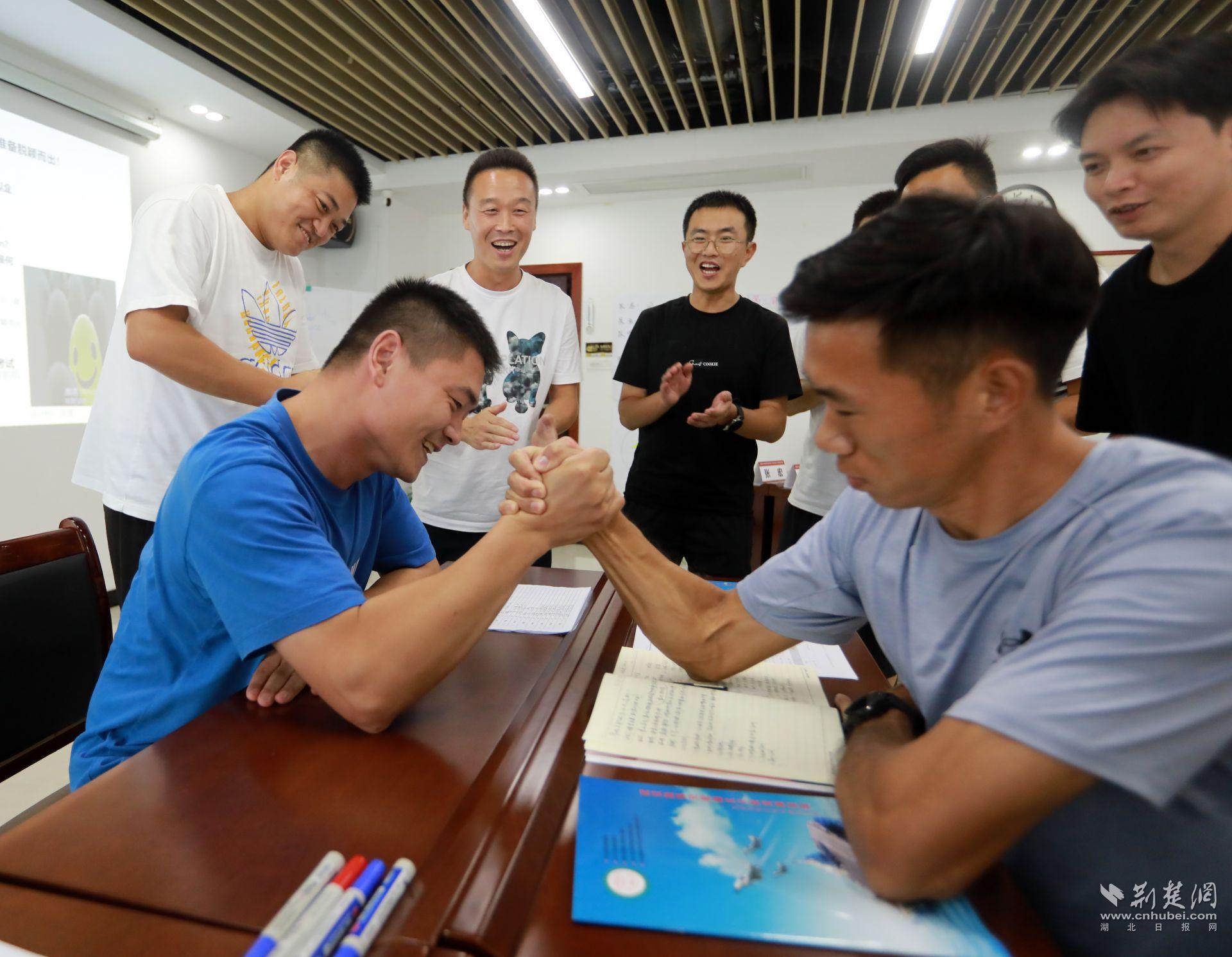 在湖北省华龙职业培训学校新老退役士兵正在进行腕力较量。通讯员供图