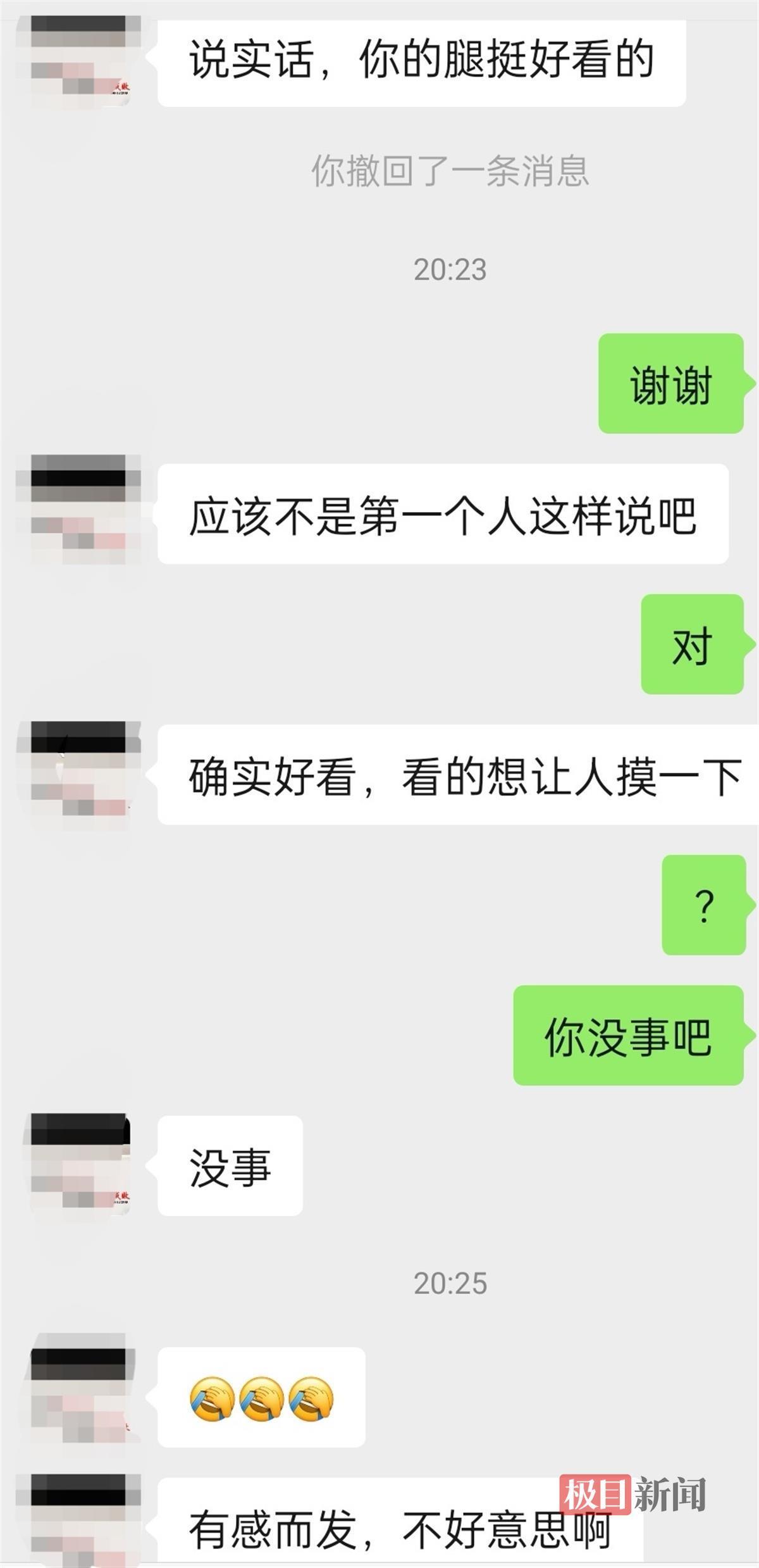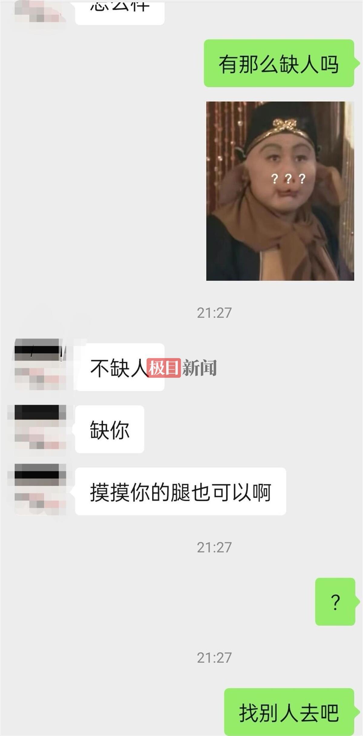 杨女士曝光的聊天记录显示,有招聘人员在与求职者聊天过程中,说出“你的腿挺好看的”“看得让人想摸一下”“不缺人,缺你,摸摸你的腿也可以啊”等话语。