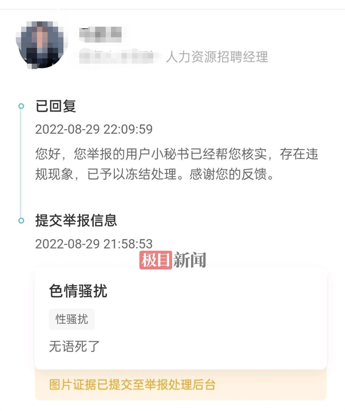 8月30日,BOSS直聘客服人员告诉极目新闻记者,该违规公司账号已于8月29日22时被永久冻结,平台对一切求职招聘过程中的骚扰行为是零容忍态度。