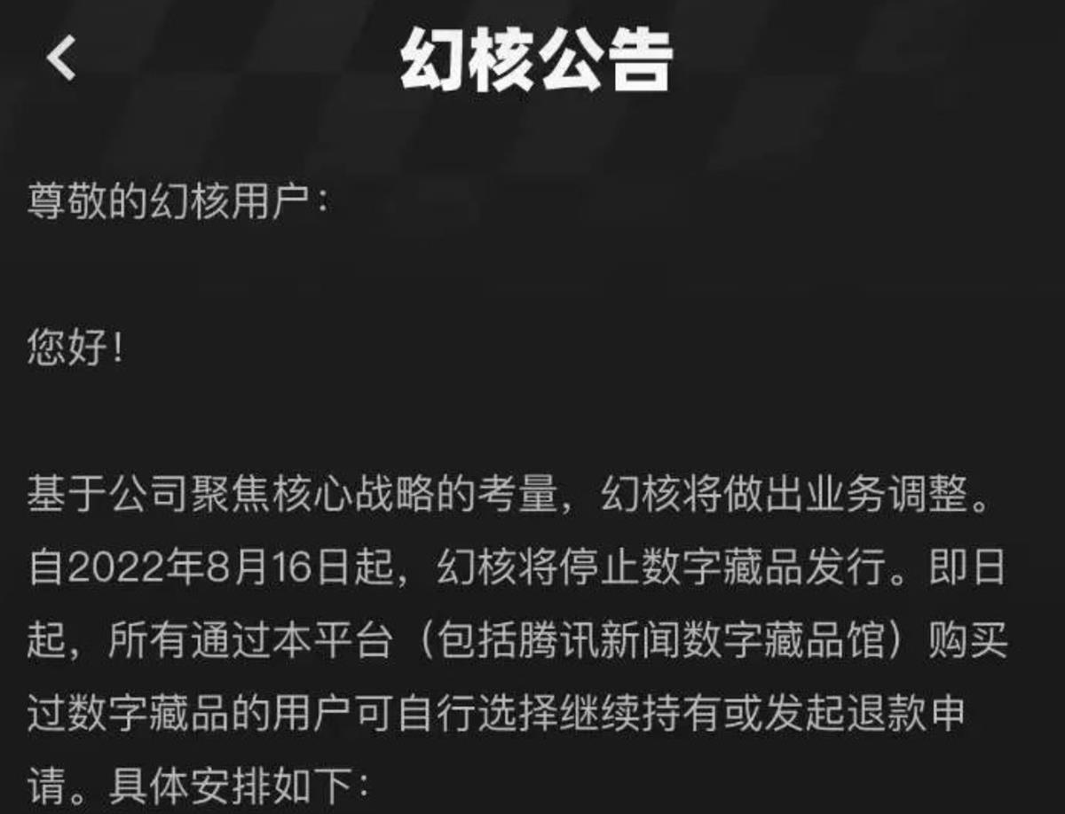 8月16日,国内最大的数字藏品平台之一——腾讯“幻核”发布公告称,将停止数字藏品发行,通过平台购买过数字藏品的用户可申请退款。