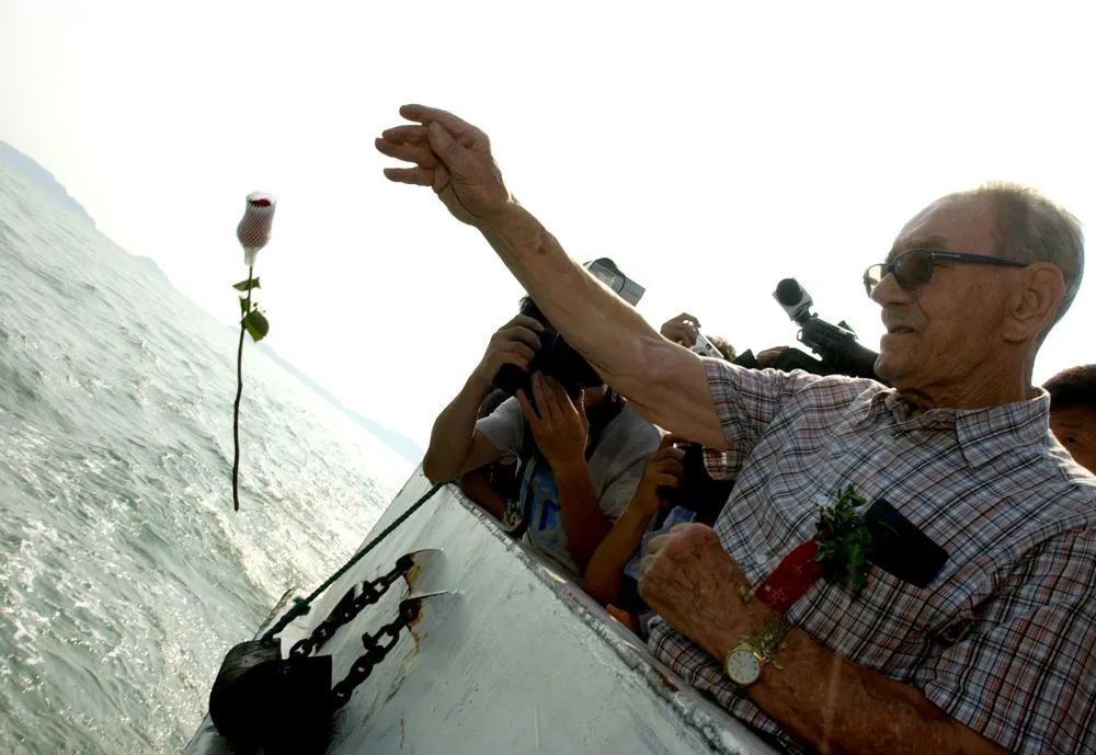 2005年8月18日,英国老兵查尔斯·佐敦在当年“里斯本丸”号军舰沉没处向殉难者献花。新华社记者黄深钢摄