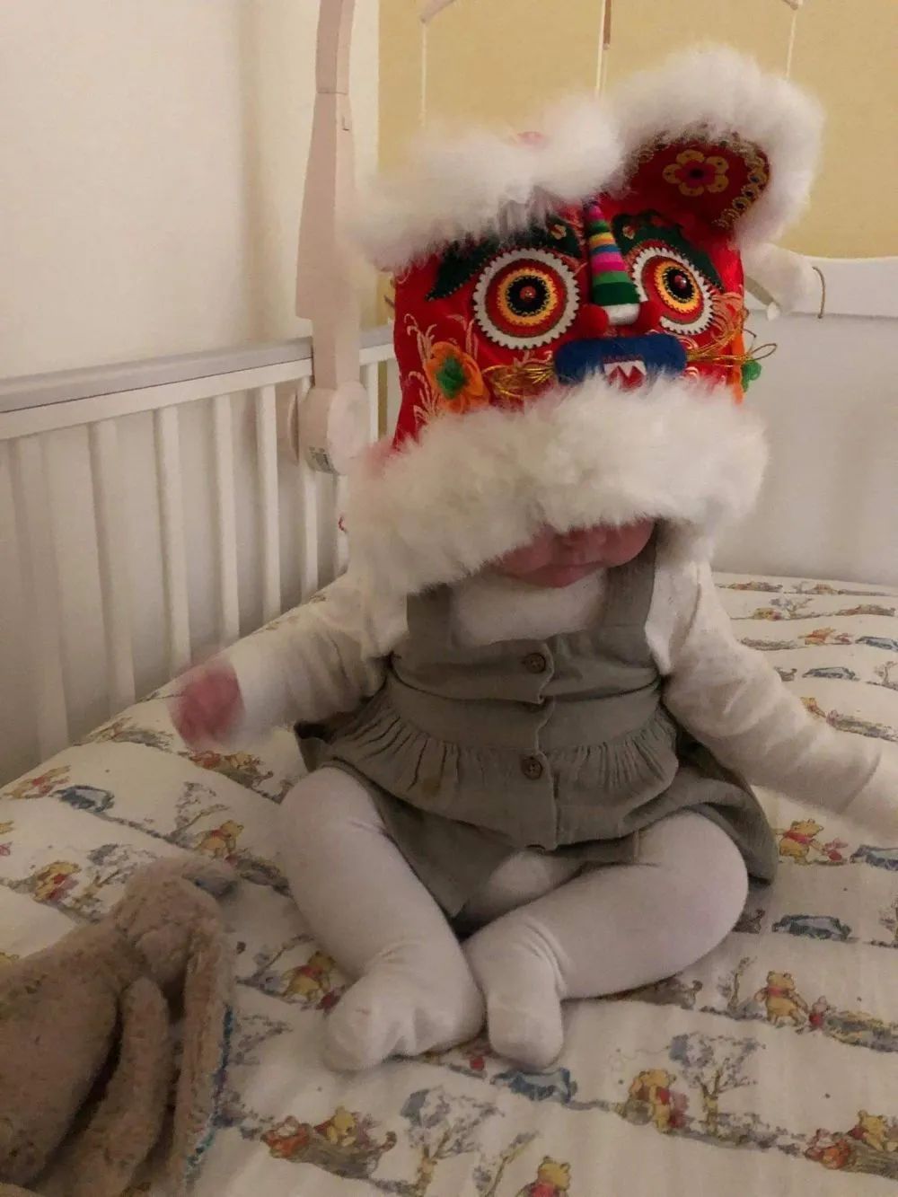 图为“里斯本丸”号船幸存者莫利(2021年去世)玄孙女露娜头戴邮自舟山的虎头帽礼物。(受访者供图)