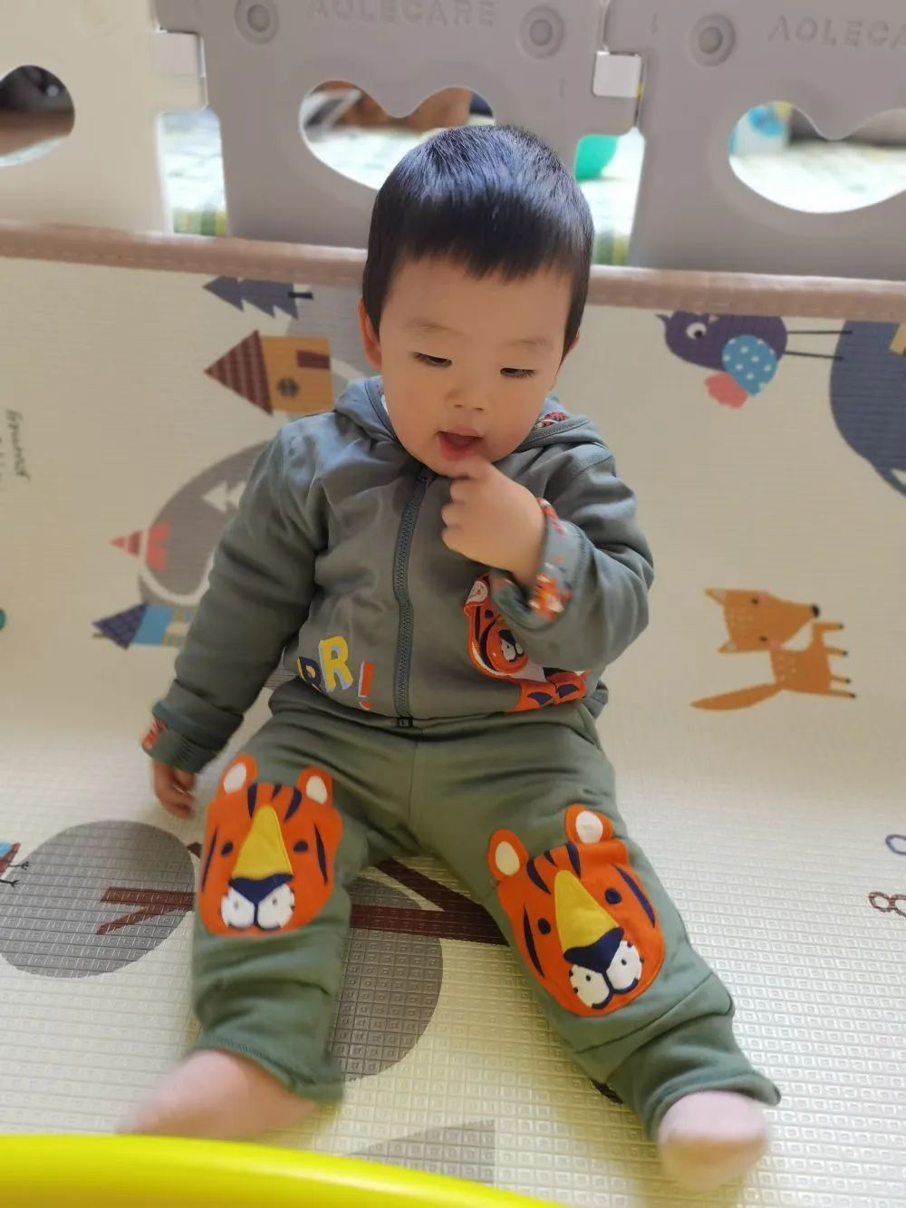 图为舟山“里斯本丸”号纪念活动组织者吴似真的儿子方正穿上了英国寄来礼物,一套老虎图案衣裤。(受访者供图)