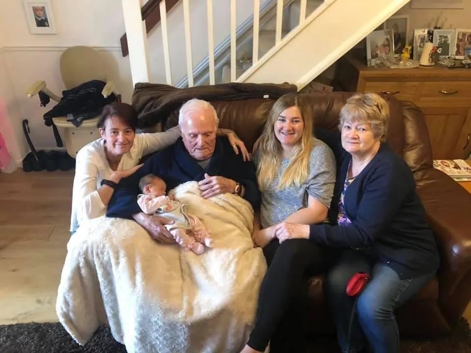 2020年拍摄的“里斯本丸”号幸存者丹尼斯·莫利一家,当时莫利的曾曾孙女露娜刚刚出生。(受访者供图)