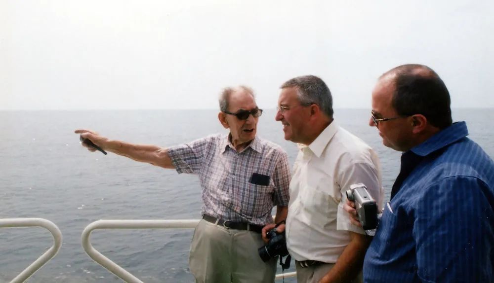 2005年8月18日,佐敦在沉船海域向两个儿子讲叙当年获救的经过。(新华社发 洪晓敏摄)