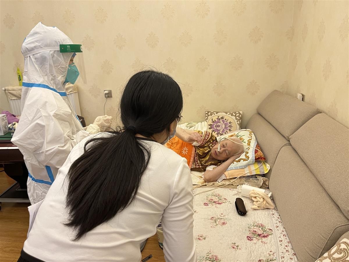 6点半,核酸采样接近尾声,“大白”和社区工作人员带好物资,走街串巷,上门为行动不便的老人采样。被包裹住的“大白”,走起路来呼吸愈发困难,为一位位白发老人采样后,又被闷出一身汗。