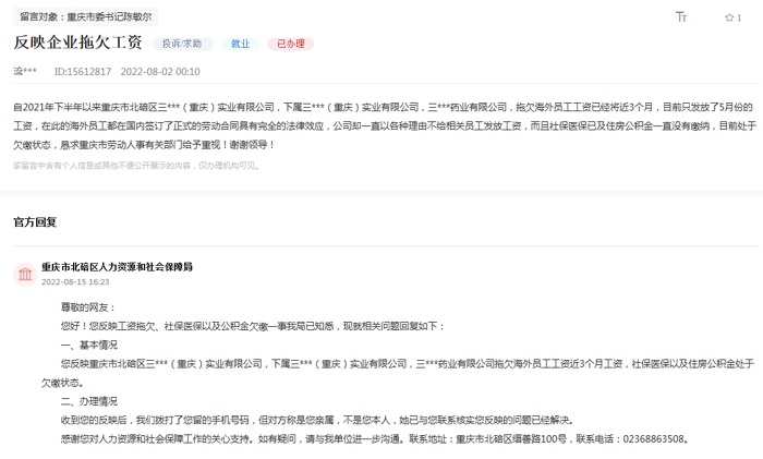 一位网友留言:“自2022年下半年以来重庆市北碚区一公司,拖欠海外员工工资已近3个月,目前只发放了5月份的工资,而且社保医保以及住房公积金一直没有缴纳,目前处于欠缴状态,恳求重庆市劳动人事有关部门给予重视!”