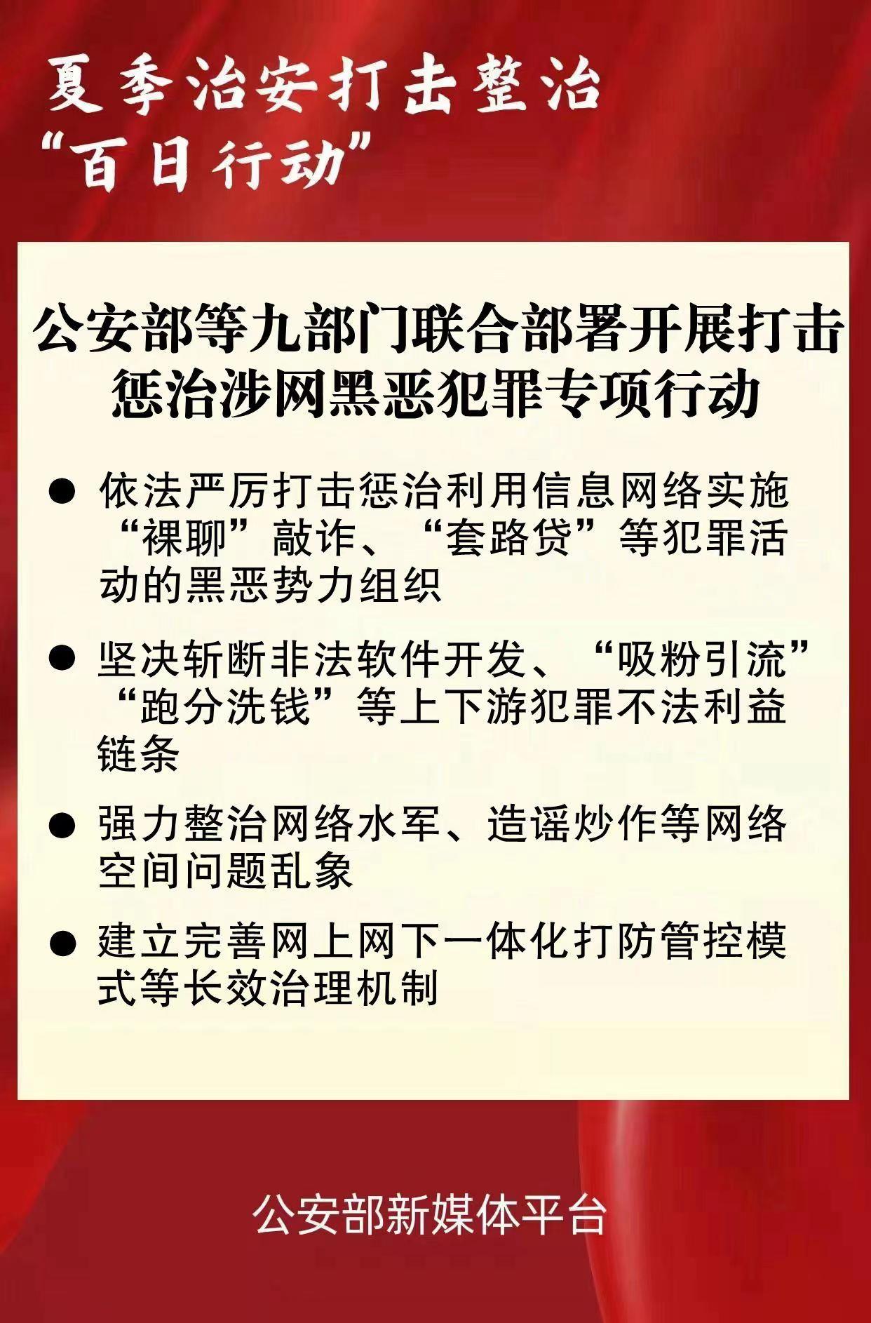 按照全国扫黑除恶斗争领导小组部署要求和2022年常态化开展扫黑除恶斗争工作安排,近日,公安部会同中宣部、中央网信办、最高人民法院、最高人民检察院、工信部、司法部、人民银行、银保监会联合印发通知,部署在全国开展为期一年半的打击惩治涉网黑恶犯罪专项行动,全力推动常态化扫黑除恶斗争在信息网络空间持续纵深开展。