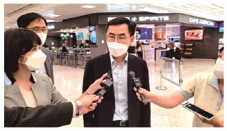 由韩国产业通商资源部新通商秩序战略室室长安城逸等人组成的韩国政府代表团当地时间8月29日抵达华盛顿,与美国就《通胀削减法案》展开协商。图为代表团成员在机场接受记者采访。 (资料图片) □ 本报驻韩国记者 王刚