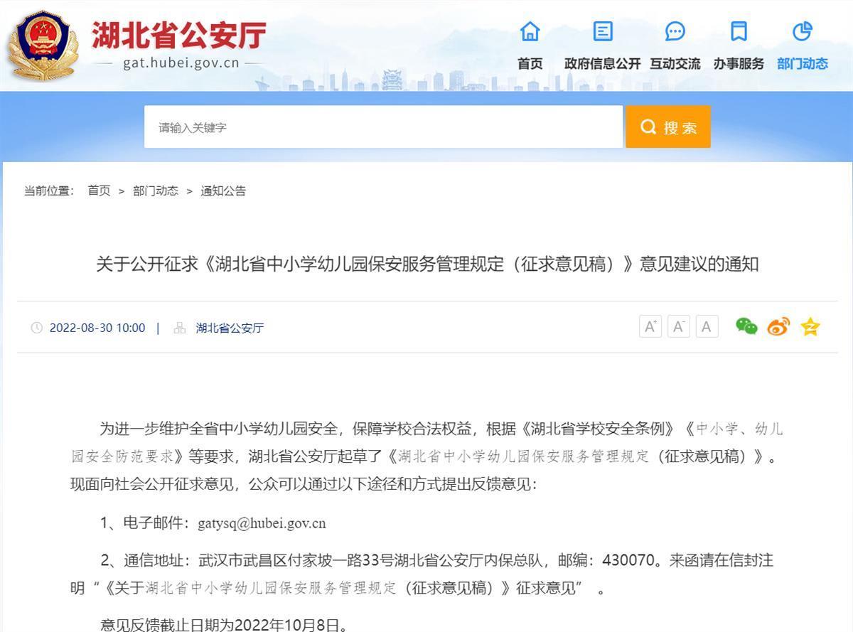 公众可以通过多种方式提出反馈意见。电邮:gatysq@hubei.gov.cn;通信地址:武汉市武昌区付家坡一路33号湖北省公安厅内保总队;邮编:430070。意见反馈截止日期为10月8日。