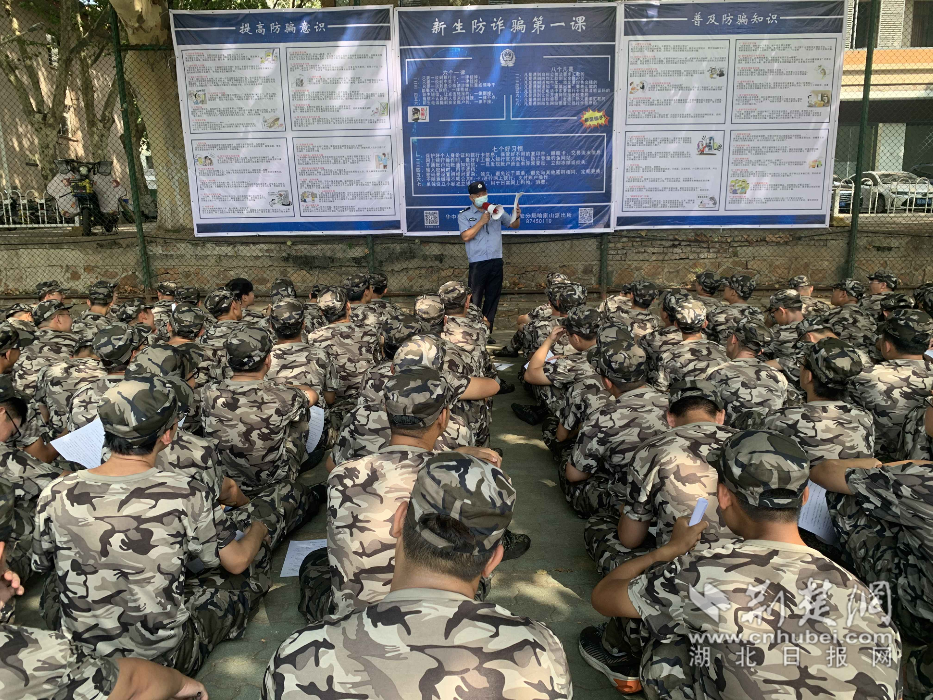 喻家⼭派出所辖区有两所重点⾼校,⺠警在开学第⼀课上给⼤学⽣讲安全防范知识,已经成为了洪⼭区多年以来警校联动的“固定动作”。今年开学季,社区⺠警熊家伟线上、线下参加两所⾼校各院系的校园安全知识宣讲已达13场。在⼤⼀新⽣的军训场上,熊家伟和同事们⻅缝插针地⾛进军训期间休息的⽅阵,将防诈骗、防盗窃等安全知识以多种形式传授给刚刚迈⼊⼤学校园的新同学。