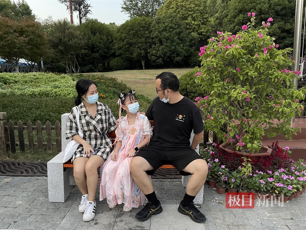 傍晚时分,在武汉东湖绿道湖光序曲广场上,不少家长带着孩子在凉椅上休憩。正在拍合照的杨女士一家三口,吸引了极目新闻记者的目光。杨女士家住武汉市江岸区,因为白天比较热,她白天没有带孩子出门,而是选择晚上来到东湖游玩。