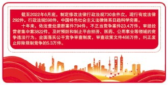 此外,我们还坚持法治是最好的营商环境,加强反垄断、反不正当竞争。以反不正当竞争为例,十年来,我国建设公平透明可预期的竞争规则迈上了新台阶,新反垄断法8月1日正式实施,两次修订反不正当竞争法,制定配套规章7部,还有平台经济、知识产权等反垄断指南8部。党中央还首次制定了《关于强化反垄断深入推进公平竞争政策实施的意见》。十年来,我国建设高效有序的市场竞争格局开创了新局面。依法查处垄断案件794件,不正当竞争案件23.4万件,审结经营者集中案3822件,及时预防和制止平台经济、医药、公用事业等领域的竞争违法行为。全面落实公平竞争审查制度,审查政策文件468万件,纠正废止排除限制竞争的5.3万件,有力促进了全国统一大市场的建设,营造各类所有制、大中小企业协同发展的良好格局。