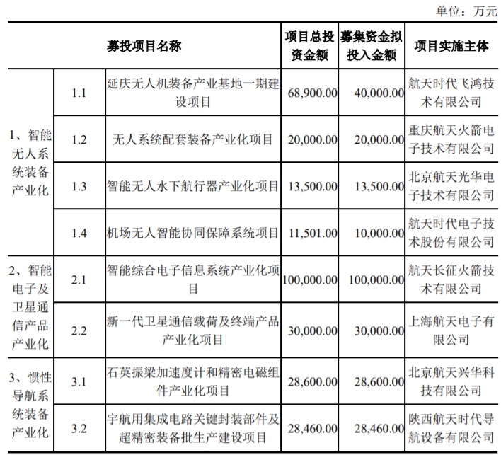 公司本次非公开发行拟募集资金总额不超过41.36亿元,其中公司控股股东的全资子公司时代远望拟以现金方式认购本次非公开发行股票金额5亿元。扣除发行费用后,航天电子拟全部用于智能无人系统装备产业化、智能电子及卫星通信产品产业化、惯性导航系统装备产业化和补充流动资金。