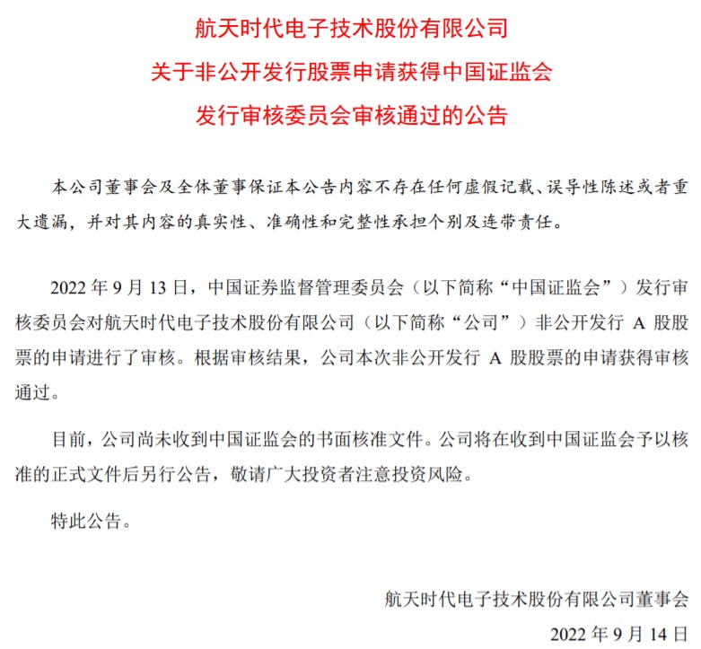 中国经济网北京9月14日讯 昨日晚间,航天电子(600879.SH)披露公告,中国证券监督管理委员会发行审核委员会对航天时代电子技术股份有限公司非公开发行A股股票的申请进行了审核。根据审核结果,公司此次非公开发行A股股票的申请获得审核通过。