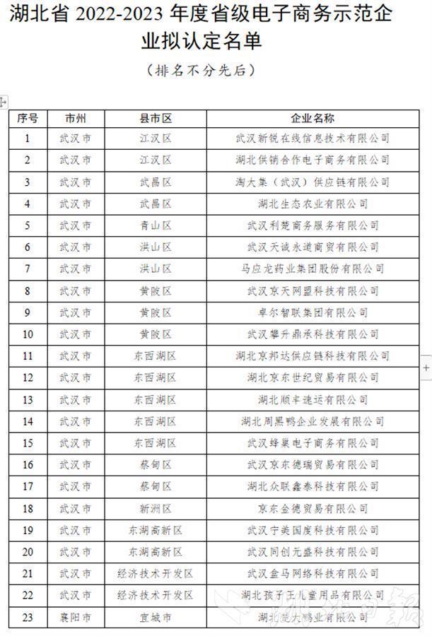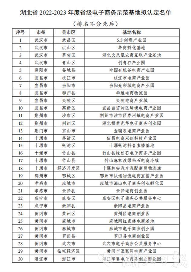 湖北日报讯(记者 李朝霞 通讯员 沈商轩)9月15日从省商务厅获悉,我省拟认定5.5创意产业园、华商孵化基地等30家基地为湖北省2022-2023年度省级电子商务示范基地,以及武汉新锐在线信息技术有限公司等100家企业为湖北省2022-2023年度省级电子商务示范企业。
