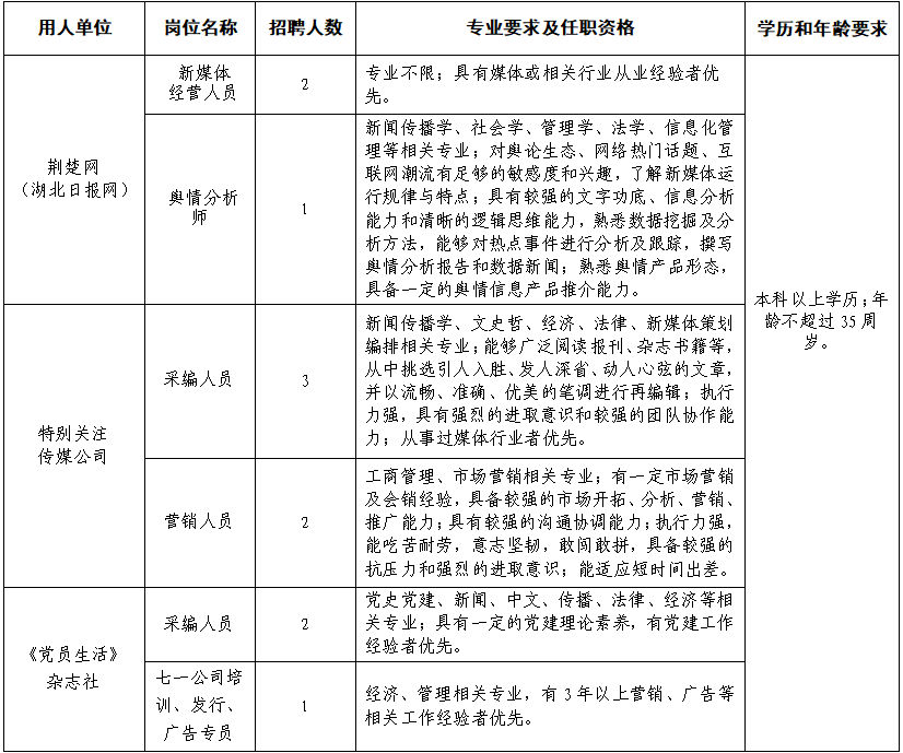 湖北日报传媒集团是以中共湖北省委机关报《湖北日报》为旗舰的大型综合性传媒集团。根据事业发展需要,集团下属荆楚网(湖北日报网)、特别关注传媒公司、《党员生活》杂志社拟面向社会公开招聘11名工作人员。现将有关事项公告如下:
