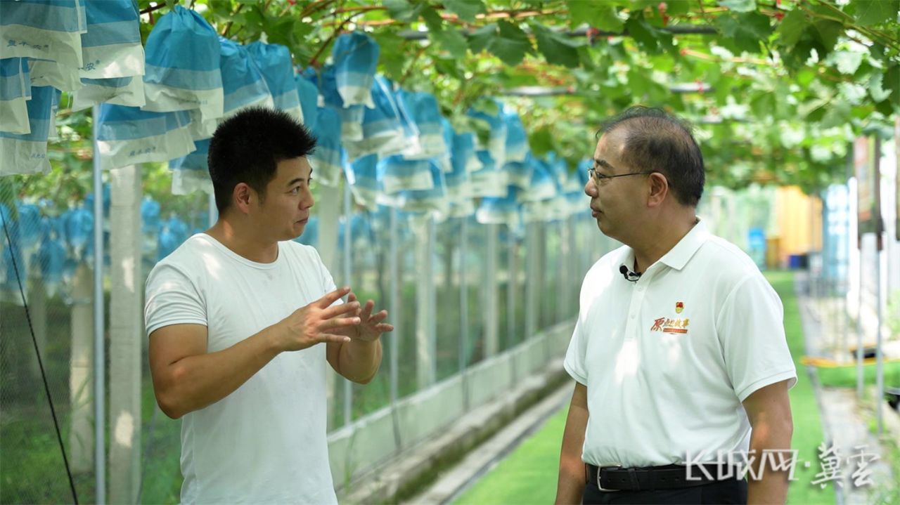 返乡创业青年边月明(左)与浙江农林大学党委书记、生态文明研究院院长沈满洪畅谈依靠葡萄种植增收致富的奋斗历程。刘佩尧 摄