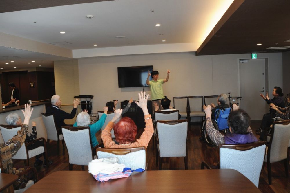 2017年2月27日,在位于日本东京品川区的养老院“日医HOME南品川”,老人在进行伸展活动。新华社记者华义摄