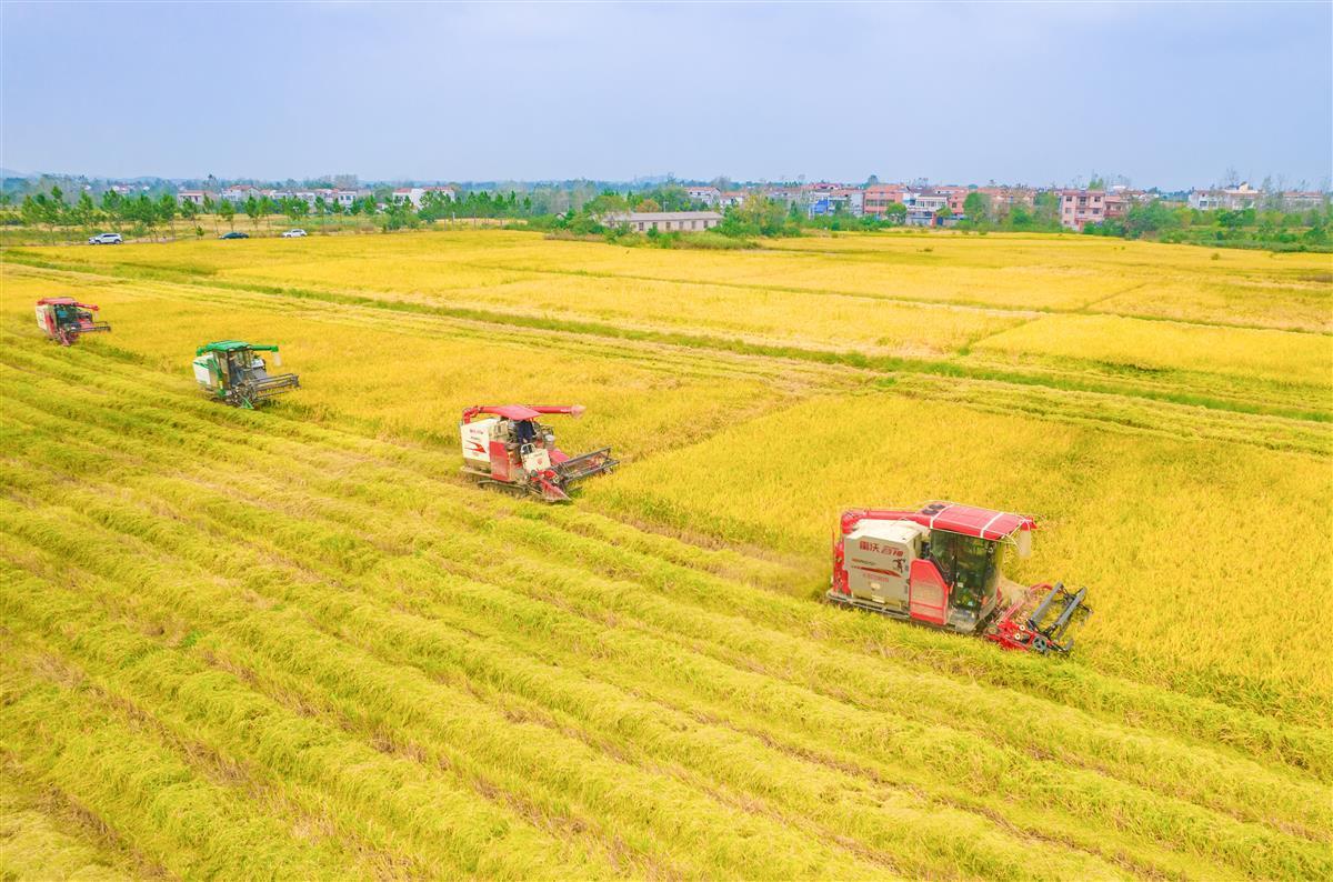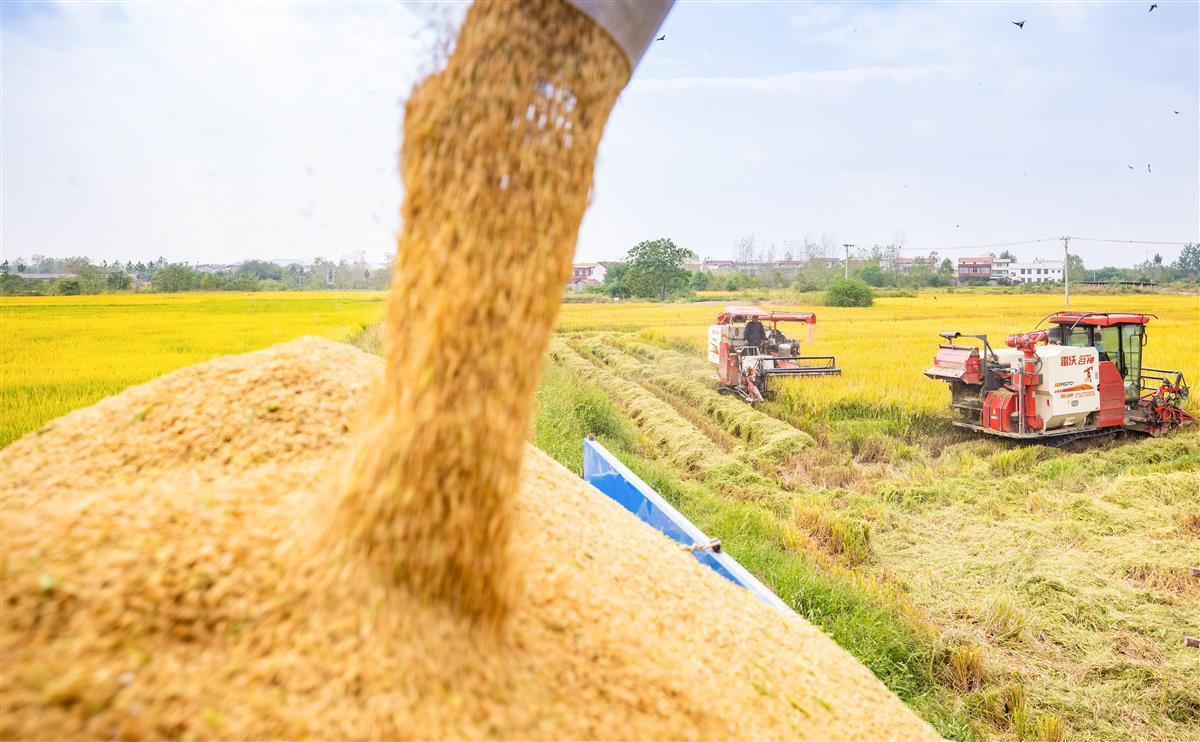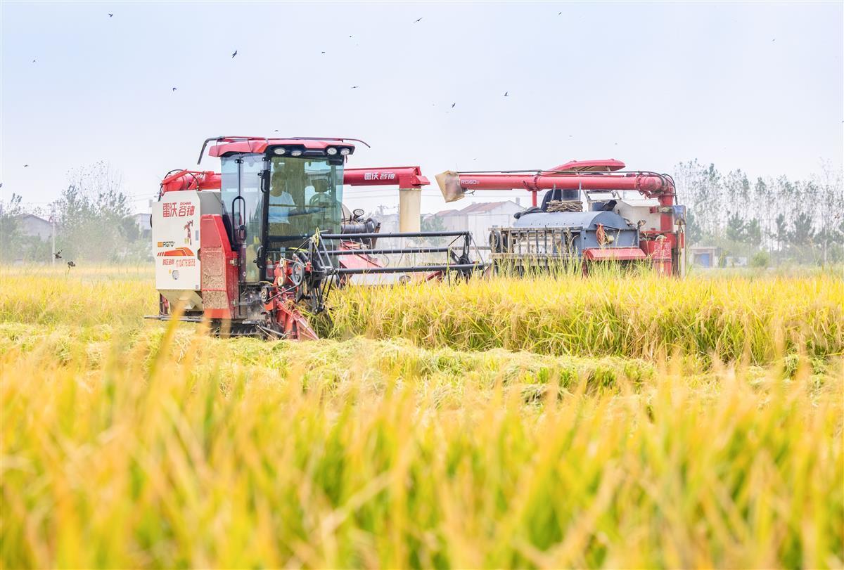 9月15日,麻城市铁门岗乡稻穗飘香喜获丰收,收割机来回穿梭收割稻谷。眼下,麻城市的水稻相继成熟,田间地头一派繁忙的丰收景象。今年,麻城市水稻种植面积60.43万亩,总产预计6.8亿斤以上。(湖北日报全媒记者 薛婷 通讯员 万永庄 肖杰 摄)
