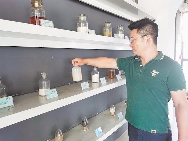 9月15日,荆州市现代石油科技发展有限公司,产品展示厅里摆满了瓶瓶罐罐。