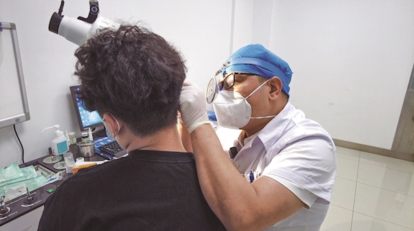 随后,一名年轻男子前来就诊。他称,耳朵里又痒又痛,有时用手抠还会流脓水。张志敏通过耳内镜检查发现,他两耳耳道内长出一层“黄痂”,取样检测后诊断为真菌性外耳道炎。“说通俗点,就是耳朵里长了‘脚气’,治疗的过程需要医生和患者都多些耐心。”张志敏一边解释,一边为该患者上药,并叮嘱他要注意保持外耳道干燥、规范用药。