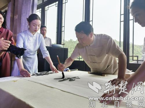 活动中,荆门书法名家们现场泼墨挥毫,提笔一气呵成,所写“蓝城中房桃花源”“厚德载物”等书法作品赢得大家称赞。