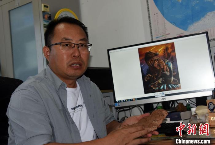 论文通讯作者、中科院古脊椎所副研究员王强介绍本次研究的恐龙蛋化石标本,及山阳盆地三类恐龙复原效果图。 中新社记者 孙自法 摄