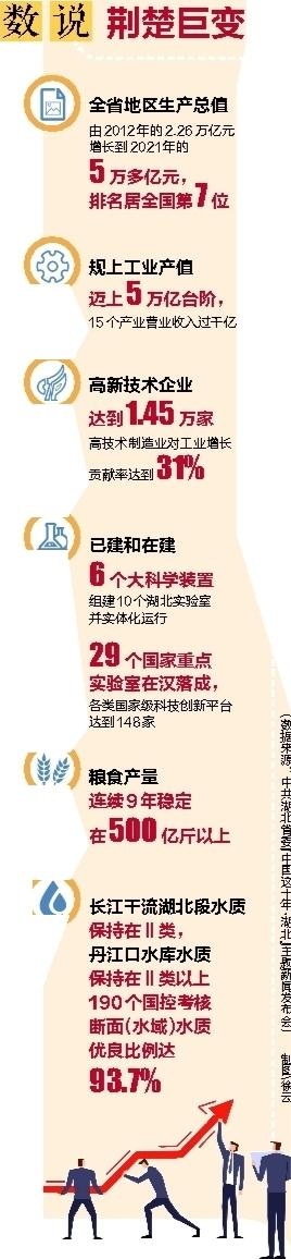 十年间,湖北坚持以习近平新时代中国特色社会主义思想为指导,打赢了长江大保护、脱贫攻坚、疫情防控、疫后重振、防汛救灾等大仗硬仗,推动“建成支点”实现历史性突破、“走在前列”迈出关键性步伐、“谱写新篇”取得标志性成果——经济总量连跨“三大关”,2012年跨越2万亿元,2016年跨越3万亿元,2021年跨越5万亿元!