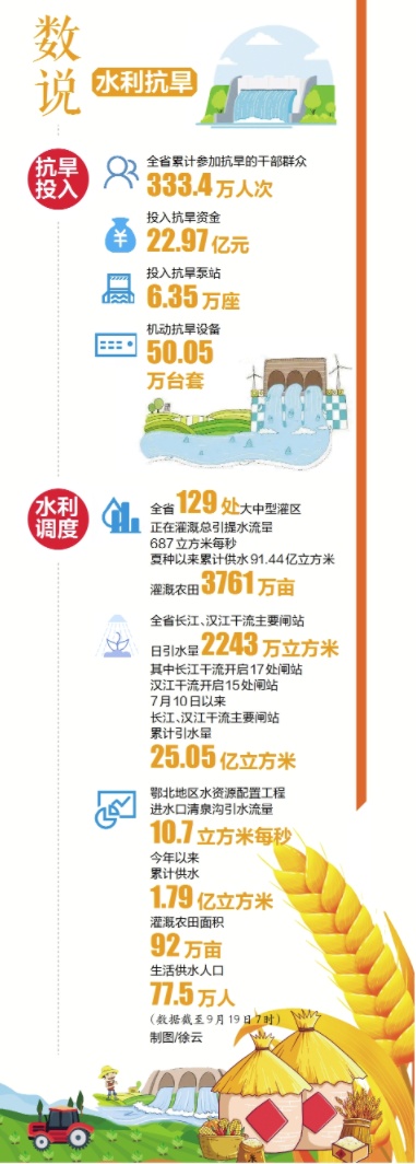 湖北抗旱也牵动水利部的心,为保障大牲畜饮水和秋粮作物生长关键时期灌溉用水需求,长江委发出调度令,三峡水库自9月14日起出库流量加大到日均9000立方米每秒。在人工降雨和水利调度的双重保障下,我省已有效缓解长江中下游干流水位快速下降趋势,保障356处大中型灌区及大量小型灌区秋粮作物生长关键期用水需求。