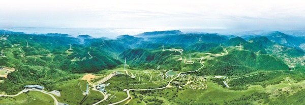 百里荒云雾缭绕,风力发电机在山顶徐徐转动,山顶景色迷人。