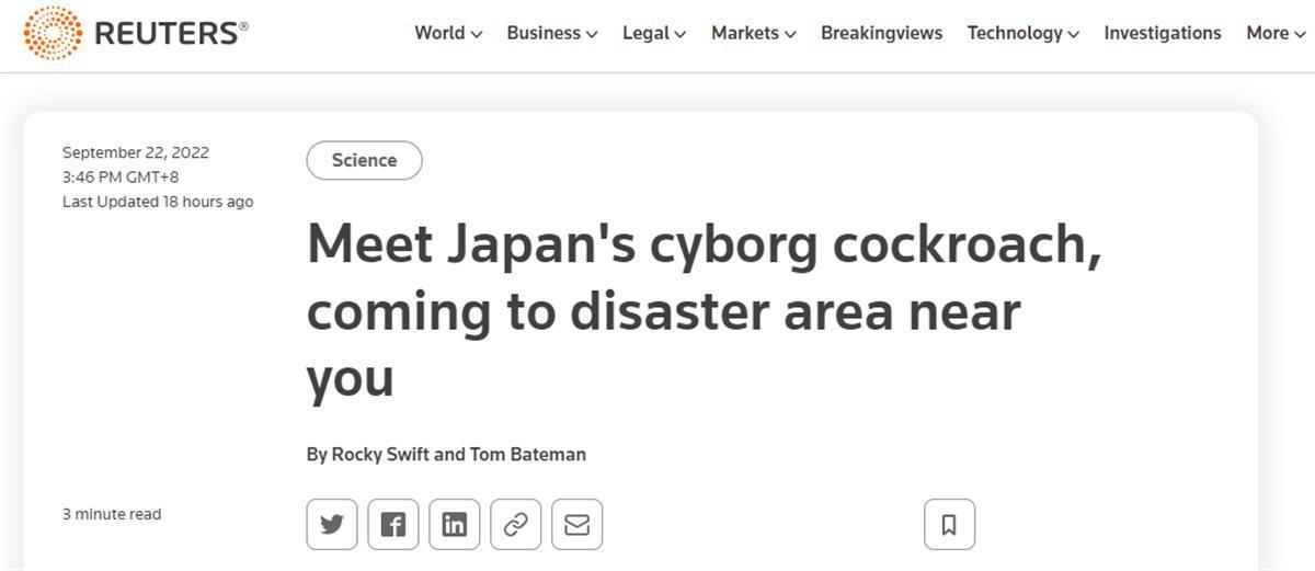 日本研究员福田健次郎(音译)在接受采访时告诉记者,“小型机器人内部的电池能量在很短的时间内就会耗尽,所以机器人用于搜寻的时间也会缩短;相比较之下,(半机械蟑螂)的一个优点就在于,蟑螂是自己移动的,所以它需要的电能远比机器人少。”